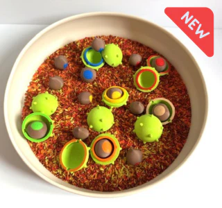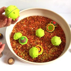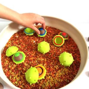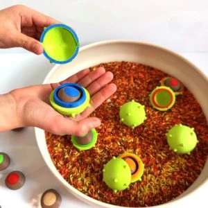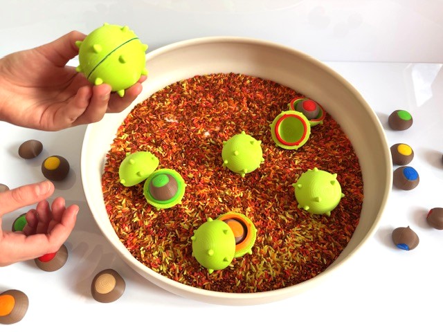 Bij dit spel kunnen de kinderen de noten (tamme en wilde kastanjes) sorteren op kleur.