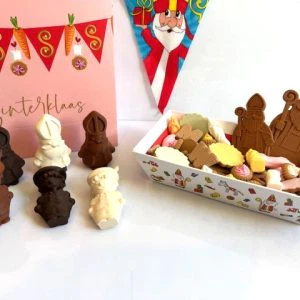 Je stelt zelf je chocolade set samen. 1 Set telt telkens 4 figuurtjes: 2x sint en 2x piet