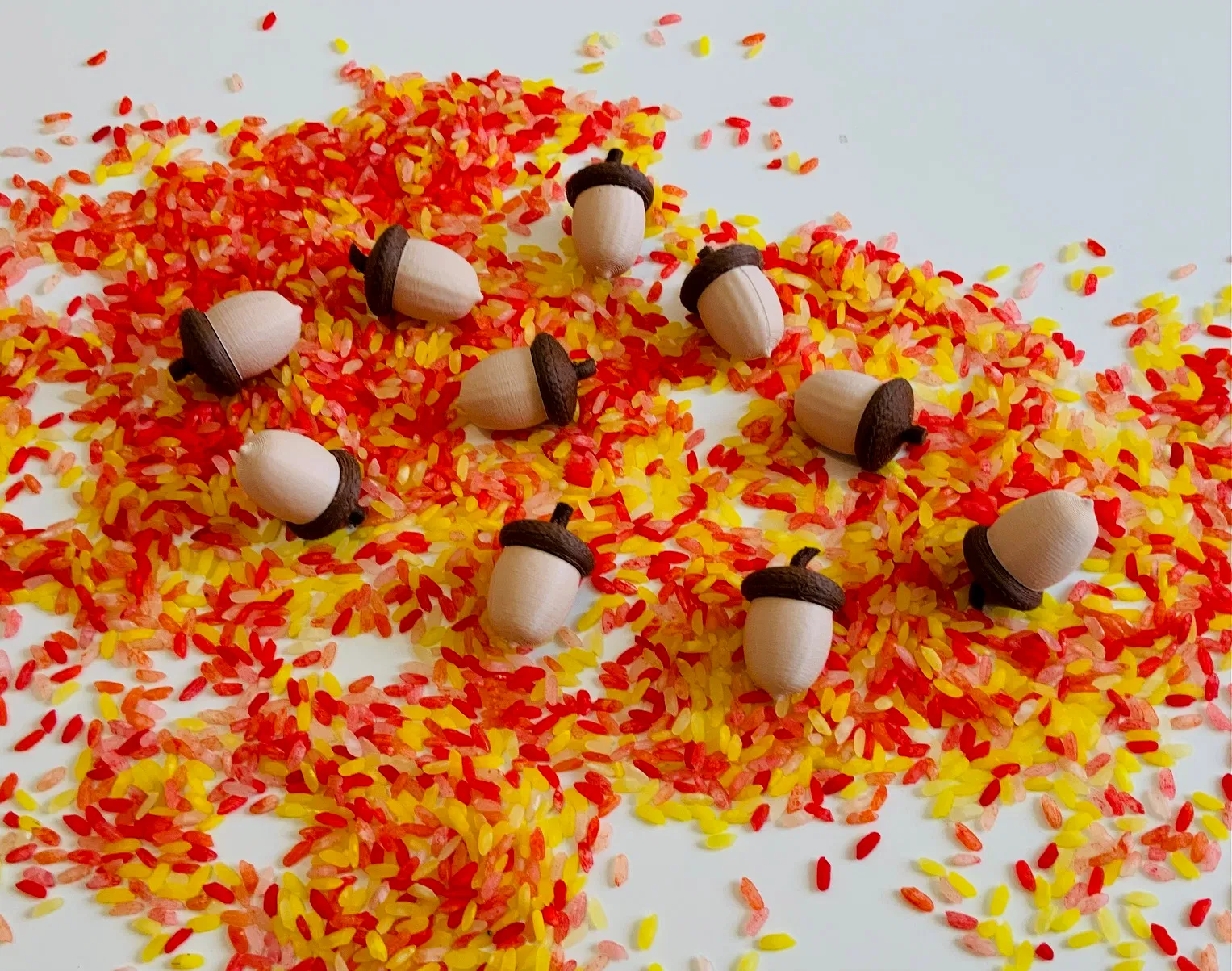 Set van 20 eikels die je kan combineren met het speeldeksel van de eekhoorn of kan gebruiken in de sensorische speelbak.