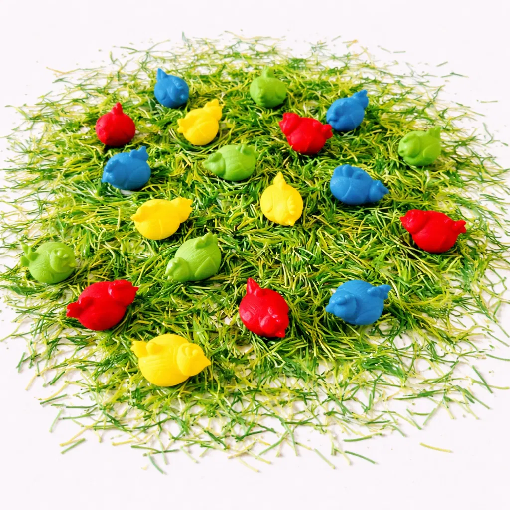 Set van 20 gekleurde kippen die je kan combineren met het speeldeksel van de kippenhokjes of kan gebruiken in de sensorische speelbak.