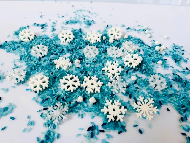 Deze ijskristallen/sneeuwvlokken kan je gebruiken in de sensorische bak of als verrijking bij het fantasiespel.
