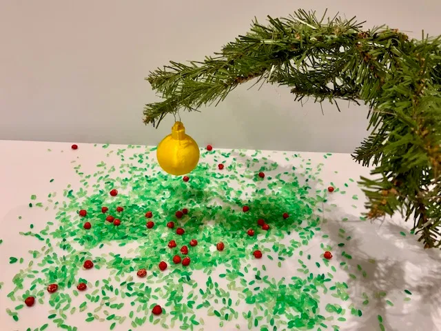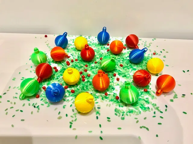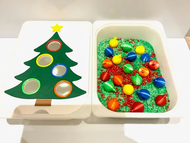 Set van 20 gekleurde kerstballen die je kan combineren met het speeldeksel van de kerstboom of kan gebruiken in de sensorische speelbak.