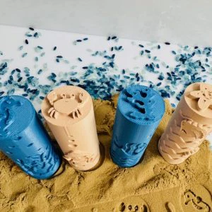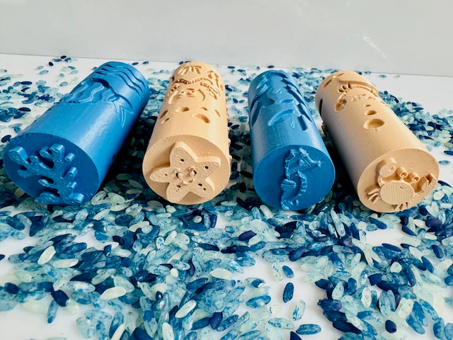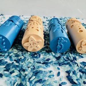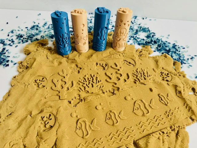 Deze rollers kunnen in speelzand, kinetisch zand en plasticine gerold worden. Tijdens het rollen verschijnt er een afdruk. De kleuters kunnen ermee rollen maar ook mee stempelen. Bovenaan de roller staat ook een figuur. Speelplezier verzekerd dus.