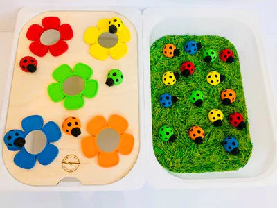 De lieveheersbeestjes worden gesorteerd volgens kleur van de bloemen.