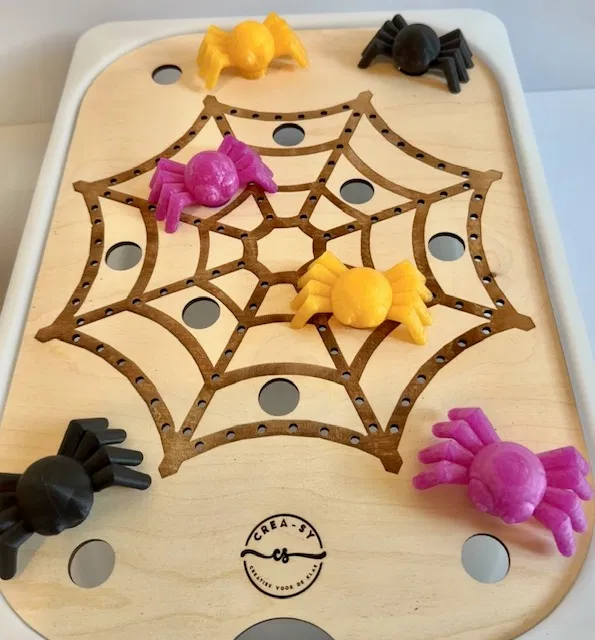 Bij dit speeldeksel kunnen de spinnen in de gaten geduwd worden. Zo blijven de spinnen bovenop het web zitten.
