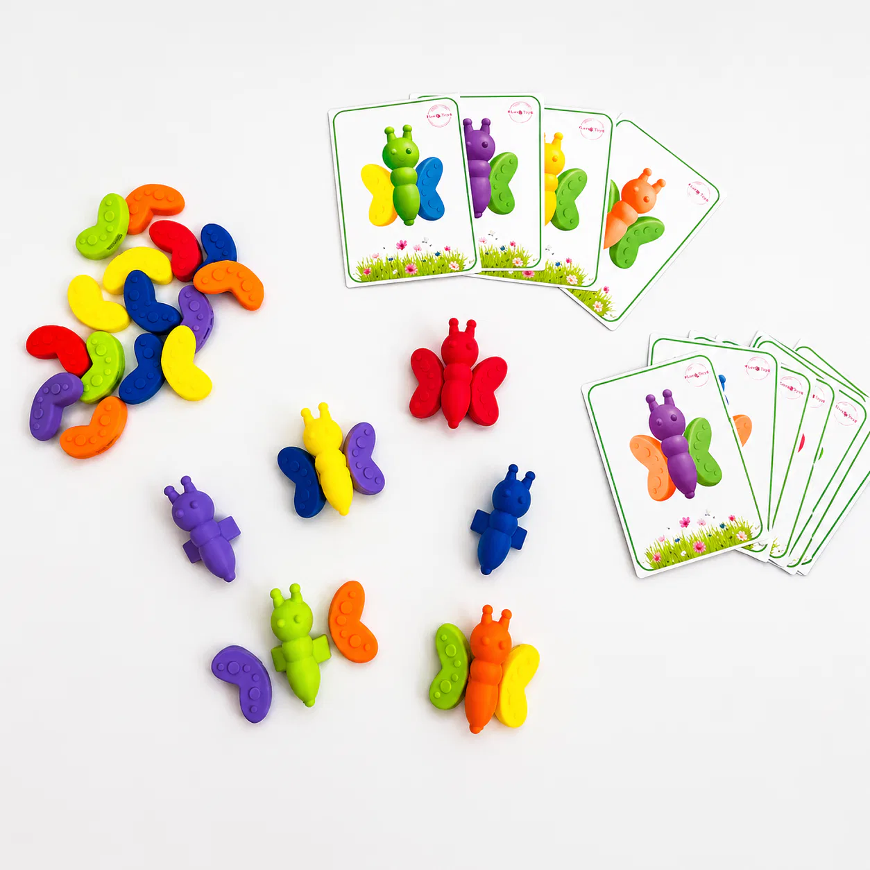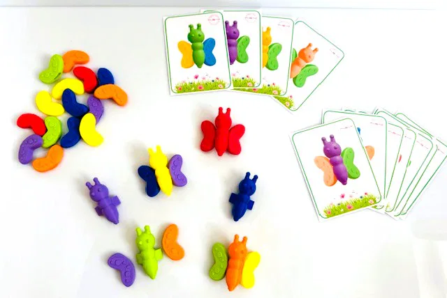 Bij dit spelletje kunnen de kinderen de vleugels zelf bevestigen aan het lijfje van hun vlinder. Ze kunnen naar hartenlust variëren.