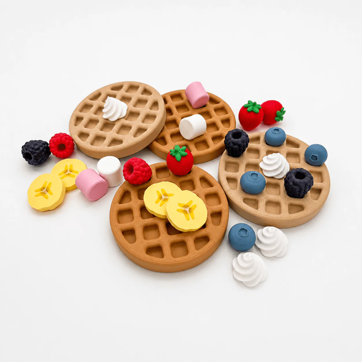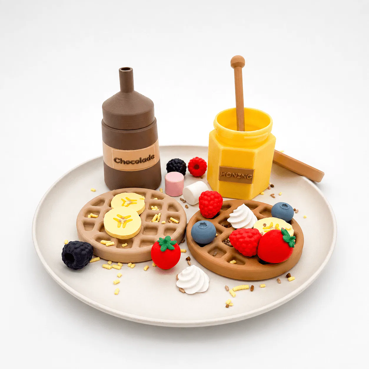Deze speelse wafel set bestaat uit 4 heerlijke wafels met toppings zoals aardbeien, bosbessen, een toefje slagroom, marshmallows, bananen schijfjes,…Met de chocolade fles en honingpot die open en dicht gaat kunnen kinderen hun eigen fantasiewafels maken en eindeloos variëren.