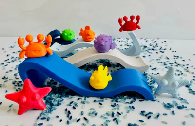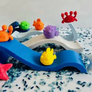 Set van 8 zeefiguurtjes (2 goudvissen, 2 puffervissen, 2 krabben, 2 zeesterren) die je kan gebruiken voor fantasiespel of in de sensorische speelbak. Ideaal om te combineren met de golvenset en de blauwe speelrijst.